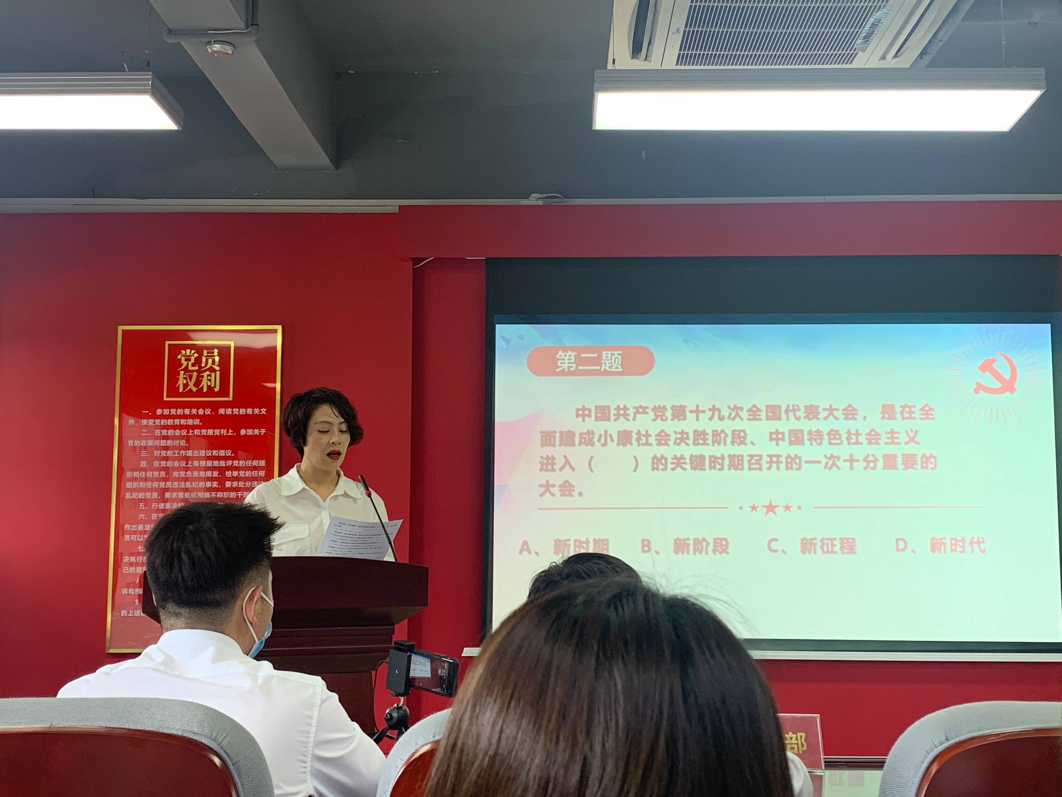 党员代表讲话,让全体员工熟知党员义务,提醒每一个人朝着这个方向不断努力。各部门代表讲话,回望过去,展望未来,制定更完善的工作计划,激励每一个员工朝着更好的方向努力。还有精彩的党史知识竞赛,让大家在竞争中更加了解党的历史,通过这种方式让大家牢记于心,实践于行。